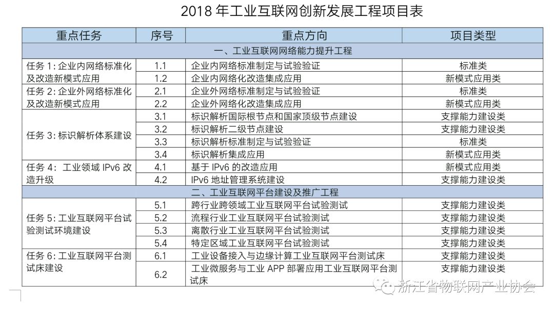 2018年工业互联网创新发展工程项目重点围绕网络、平台、安全三大体系:一是工业互联网网络能力提升工程相关项目;二是工业互联网平台建设及推广工程相关项目;三是工业互联网安全保障能力提升工程相关项目。详细项目表见附1。
