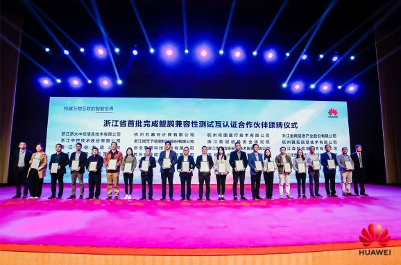 华为中国鲲鹏生态与解决方案销售部部长张英梗,华为中国智能计算渠道与商业销售部部长陈超为浙江省首批完成鲲鹏兼容性测试互认证的19家成员单位颁发证书,包括中控信息,银江股份,恒生电子,安恒信息和创业慧康等单位。此举对于促进浙江省核心技术创新突破,提升信息产业和数字经济综合竞争力有重要推动作用。