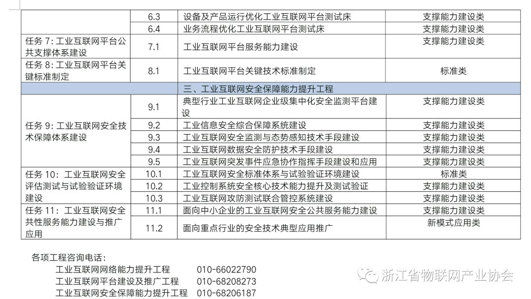 1.工业互联网创新发展工程。围绕《国务院关于深化“互联网+先进制造业”发展工业互联网的指导意见》提出的建设工业互联网网络、平台、安全三大体系要求,一是提升工业互联网网络能力,重点支持工业互联网标识解析体系建设、集成创新应用、关键技术和标准研究与试验验证,推动工业企业内、外网络改造和IPv6改造升级。二是工业互联网平台建设及推广,重点支持建设工业互联网平台试验测试体系、公共服务体系和标准体系。三是提升工业互联网安全保障能力,重点支持研制安全标准规范,推动安全技术手段建设,促进安全产业发展。
