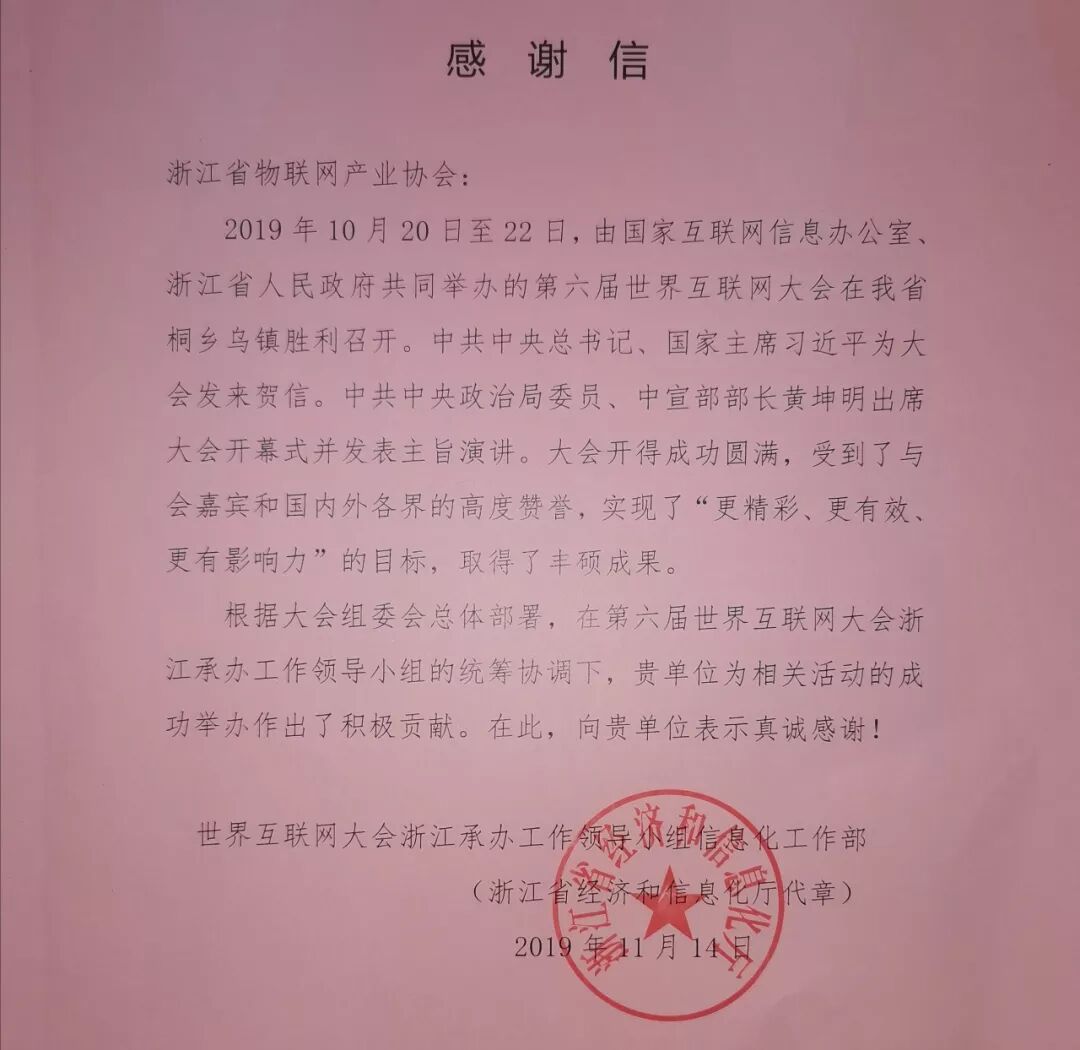近日,世界互联网大会浙江承办工作领导小组信息化工作部(浙江省经信厅)向浙江省物联网产业协会等致感谢信。感谢为第六届世界互联网大会相关活动成功举办作出了积极贡献。